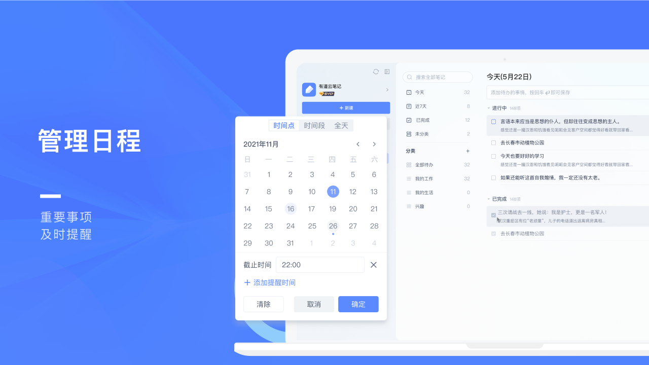 待办功能让用户能够用简洁直观的方式记录重要事项或日程规划。用户可以妥善安排时间,直观便捷地管理待办事项,更高效地组织当前的工作、学习和生活。待办事项可以设置提醒,确保用户不会错过重要任务。同时,用户可以对已完成的待办事项进行标记,方便回顾和总结。待办功能与笔记功能相结合,让用户能够更好地统筹各项任务,提高工作效率。