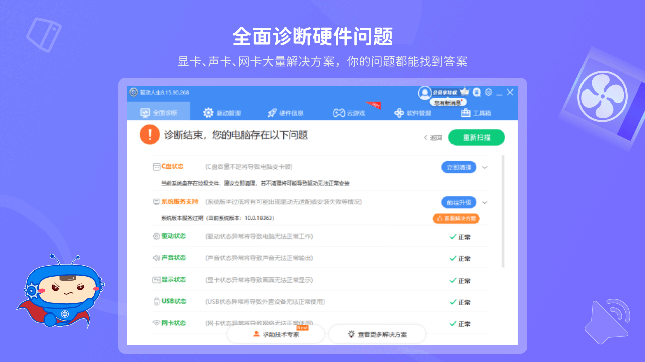 驱动检测与更新:自动检测电脑硬件设备驱动状态,全面扫描并清晰列出需更新或修复的驱动程序,便于用户及时将其更新至最新且稳定的版本,保障硬件正常运转。