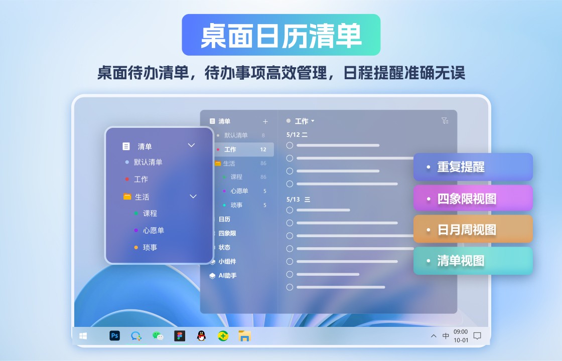 软件为您提供了便捷的桌面待办提醒功能,如同您的私人秘书,时刻为您守护重要事项。您可以轻松地将每天需要完成的任务添加到待办列表中,无论是工作任务、学习计划还是生活琐事,都不会被遗漏。