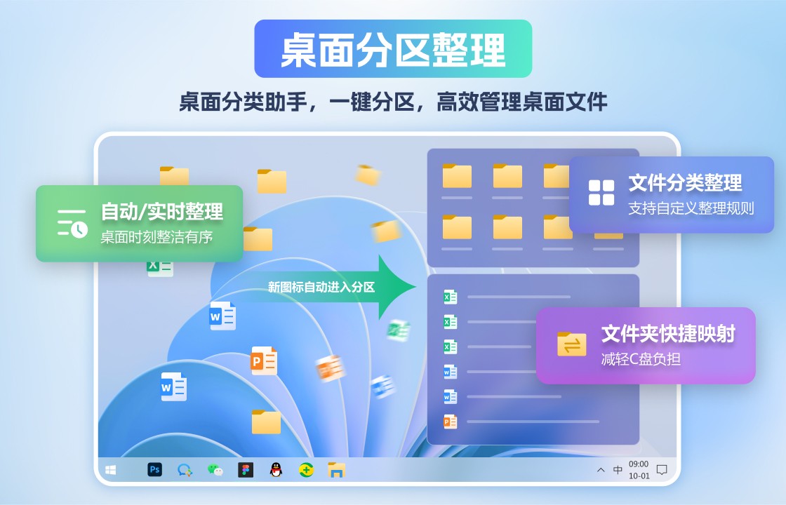 这款软件为您带来了智能桌面整理功能,让您的桌面焕然一新。它就像一位专业的桌面管家,能自动识别桌面上的各种图标和文件,将它们按照您设定的规则或者系统默认的智能算法进行分类整理。无论是经常使用的办公软件图标,还是偶尔才会打开的娱乐文件,都能各归其位,使桌面变得干净整洁、井然有序。这种智能整理不仅让您的桌面看起来更加清爽,还能有效节省系统资源,释放宝贵的桌面空间,让您的电脑运行更加流畅。