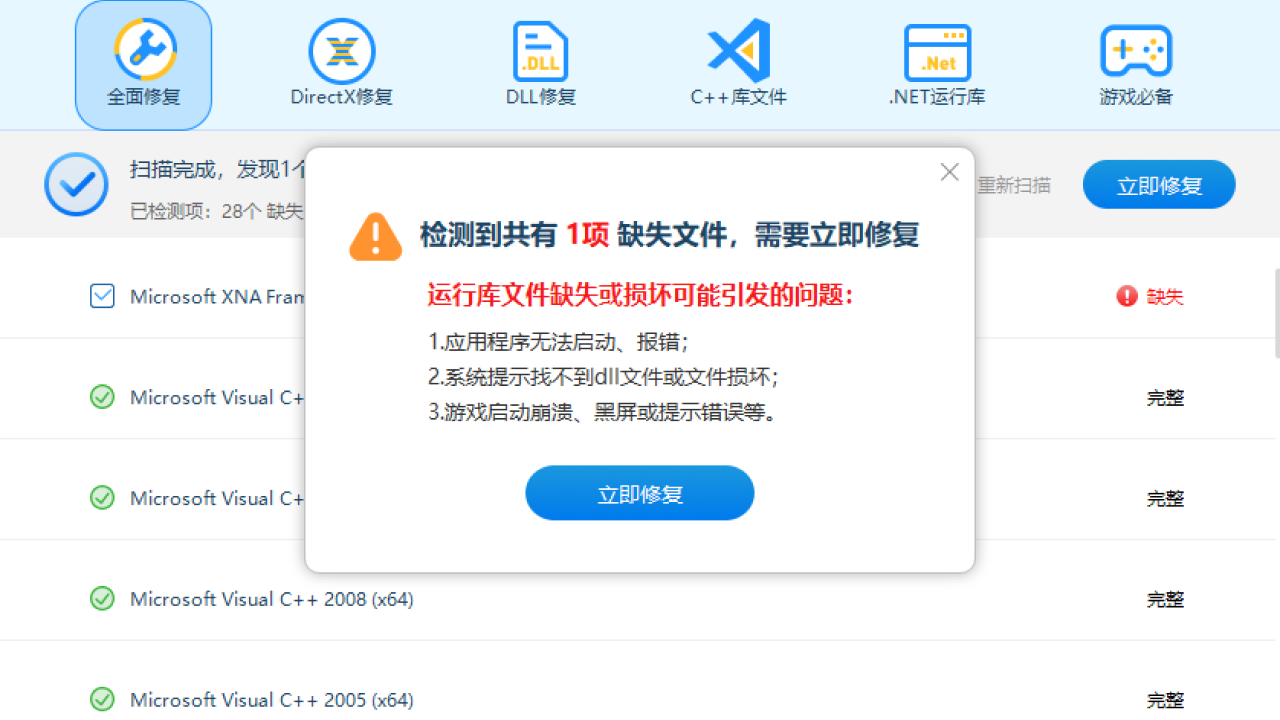 常见游戏报错一键修复,告别 DLL 缺失导致的游戏问题