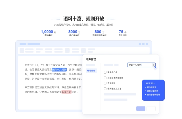 拥有超 10000 亿语料字数、8000 万核心库条数以及 800 万错误规则库条数,并配备 79 个专业词库,为校对工作提供了坚实的基础。同时,开放的用户词库支持自定义新词、错词、敏感词与重点词,充分满足不同行业、不同用户群体的个性化校对需求,让校对工作更贴合实际使用场景,精准度进一步提升。