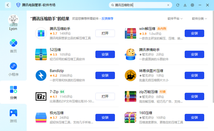 腾讯压缩助手目前集成在腾讯旗下腾讯电脑管家当中,用户们只需要下载并安装最新版腾讯电脑管家,然后在腾讯电脑管家软件管家里面搜索“腾讯压缩助手”即可免费安装,并体验无广告免费的解压缩软件。