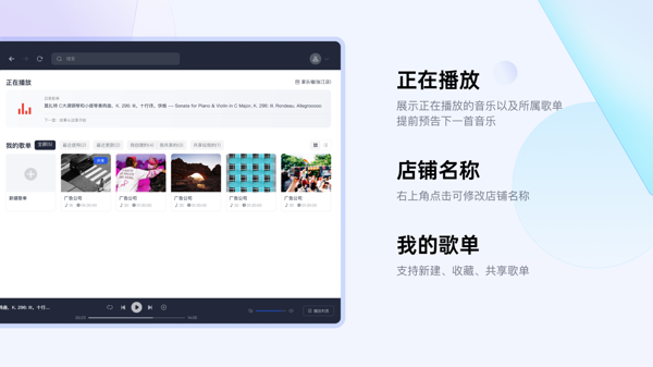 猴子公播音乐适用于商店、餐厅等多种场景,能够让用户自由设计使用,海量优质歌曲歌单在线创建收藏,还内置了不同风格的播放收听模式可以体验,让用户收听到更多更优质的歌曲。