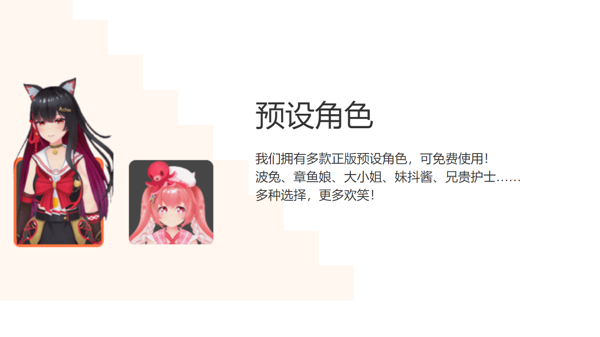 丰富正版预设角色随心选用与自由创作激发:软件内置了多款精心设计的正版预设角色,如可爱俏皮的波兔、神秘奇幻的章鱼娘、高贵优雅的大小姐、温柔甜美的妹抖酱以及幽默风趣的兄贵护士等,这些预设角色涵盖了多种不同的风格与形象类型,主播可根据直播主题、个人喜好以及观众受众群体等因素,自由选择并免费使用这些预设角色进行直播活动。