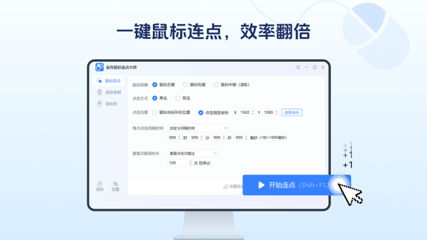 鼠标连点器大师可以自动模拟鼠标点击,帮助用户轻松处理执行众多的重复点击任务,支持设置快捷键和停止点击操作,不需要频繁复杂的操作,快速提升工作效率。