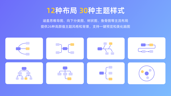 丰富多元的脑图架构:拥有多达 16 种布局结构,从经典的思维导图,到条理清晰的向右逻辑图、层次分明的组织架构图、细致入微的向下分类图,再到针对性强的鱼骨图、括号图等,一应俱全。