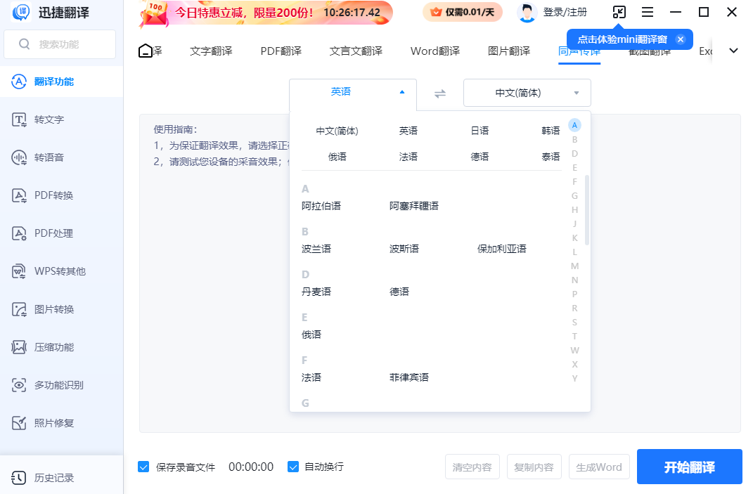 迅捷翻译之中用户可以使用该软件快速完成多种格式的翻译,在翻译软件之中用户可以轻松解决大篇幅的文字文件并且可以直接进行图片处理,直接提取文字并且翻译,非常方便用户办公使用。
