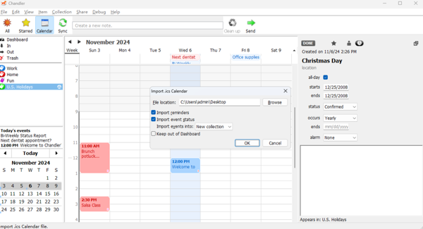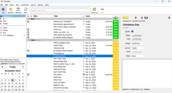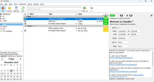 Chandler电脑版是一款全能的个人信息管理软件,Chandler最新版提供了丰富的功能来帮助用户高效管理日常生活和工作事务,直观的日历视图,用户可以轻松添加、编辑和查看日程安排,系统会自动提醒即将到来的事件或待办事项,确保用户按时完成任务。