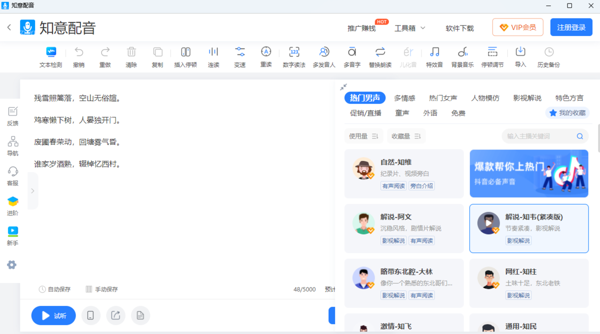 知意配音电脑版是一款功能丰富且操作简便的智能配音软件,知意配音2025最新版能够生成的语音清晰自然,音质接近真人配音,能够准确表达文本内容的情感与语气,提供多种语音风格,妹纸标准男声、女声、不同年龄段的配音风格以及不同方言选择。