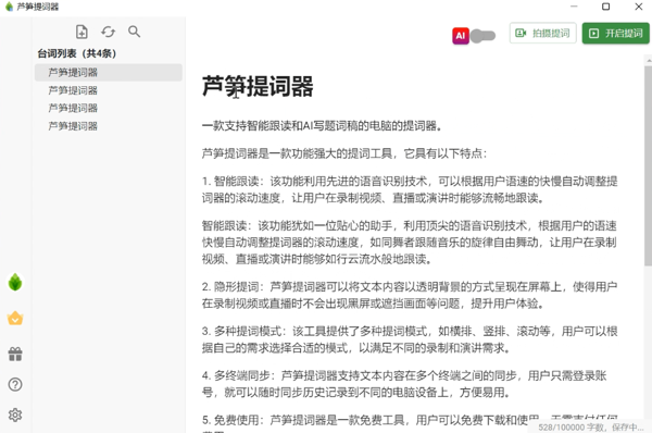 AI 赋能,创作高效:芦笋提词器搭载强大的 AI 功能,为用户文本创作提供全方位支持。它能够对提词标题进行智能优化,使其更具吸引力。