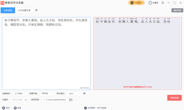 注音效率高:支持百万字级别的文字注音任务,处理速度极快,百万文字注音仅需一分钟。无论是处理长篇文章,还是大量文档,都能快速完成注音,可满足教学、出版等场景的大规模文字处理需求。