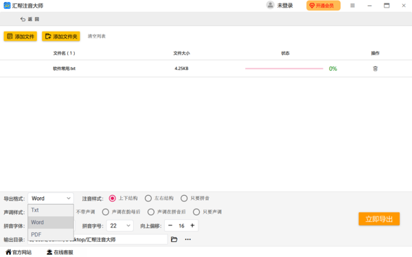 汇帮注音大师电脑版是一款高效便捷的汉字注音工具,汇帮注音大师PC客户端提供丰富的拼音显示方式,支持上下结构、左右结构等不同布局,支持批量导入文件,自动为文件中的汉字添加拼音,完成注音后,可直接将结果导出为Word、TXT或PDF格式,方便后续使用。