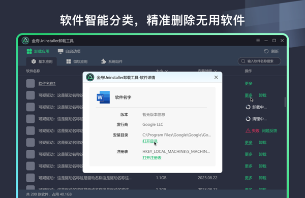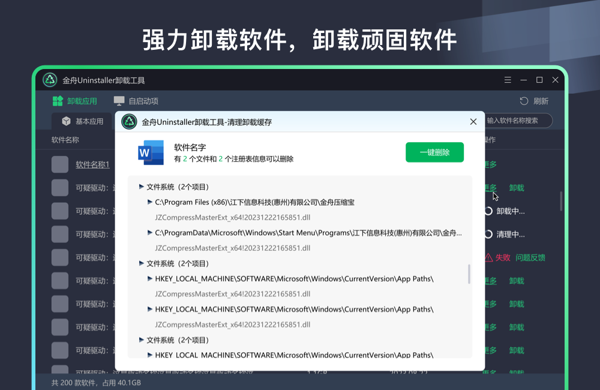 金舟Uninstaller卸载工具2025最新版是一款功能强大的应用卸载工具,可以彻底的清理删除不需要的文件,金舟Uninstaller卸载工具电脑版不仅能有效的卸载应用程序,还可以清理系统中的垃圾文件和注册表项,轻松释放更多的存储空间,提升硬件设备性能。
