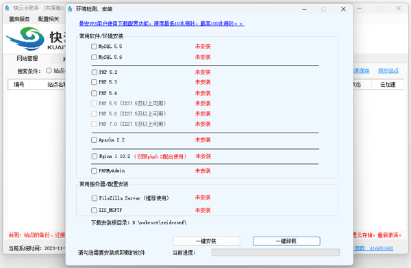 快云小助手软件提供一键自动配置环境的功能,可以快速安装并配置PHP、MySQL、Zend、PHP-MyAdmin、FTP等常用组件。