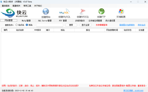 软件提供了一个简洁直观的图形化界面,将站点管理(IIS)、数据库管理(MySQL)、用户管理(系统/FTP)、FTP管理等原本需要在多个不同管理工具(如IIS管理器、MySQL命令行、系统用户管理)中进行的操作集成在一起。