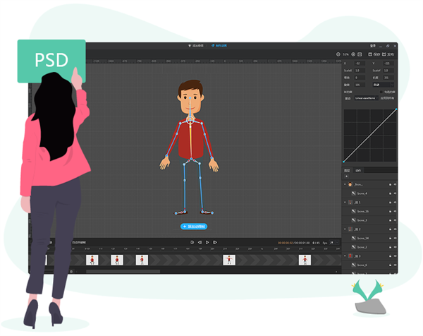 万彩骨骼大师软件可以让用户对各个骨骼节点进行旋转、缩放、平移等操作,制作出各种动作,支持关键帧设置,用户能够轻松制作流畅的动画效果。