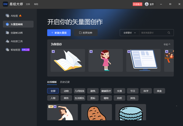 万彩易绘大师免费版是一款功能强大的AI图形设计和动画制作软件,万彩易绘大师电脑版能够帮助用户轻松制作各种图形、动画和视频内容,提供了丰富的设计工具,帮助用户快速设计各种海报、卡片、宣传单等图形内容,可以轻松创作自己满意的作品。