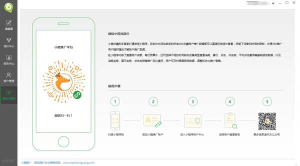 支持小程序关联:打通微信小程序,用户可直接在小程序内查看绑定的 360 账户的推广报告数据,包括账户余额、每日预算等,能突破设备和时间限制,随时随地掌握账户推广动态。