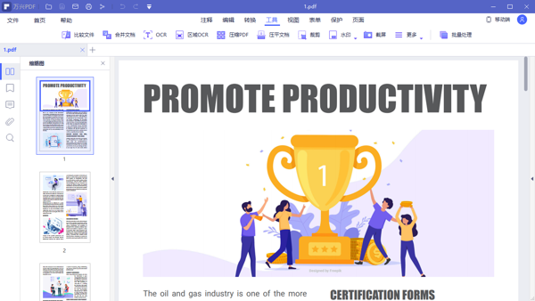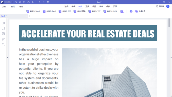 万兴PDF免费版是一款功能全面的PDF文件管理工具,万兴PDF电脑版提供了多种处理功能,能够帮助用户查看、编辑、转换PDF文档等,方便用户高效地管理和编辑PDF文件的页面内容,支持批量处理大量的文件,提升文档处理的灵活性。