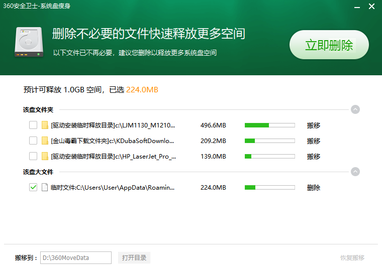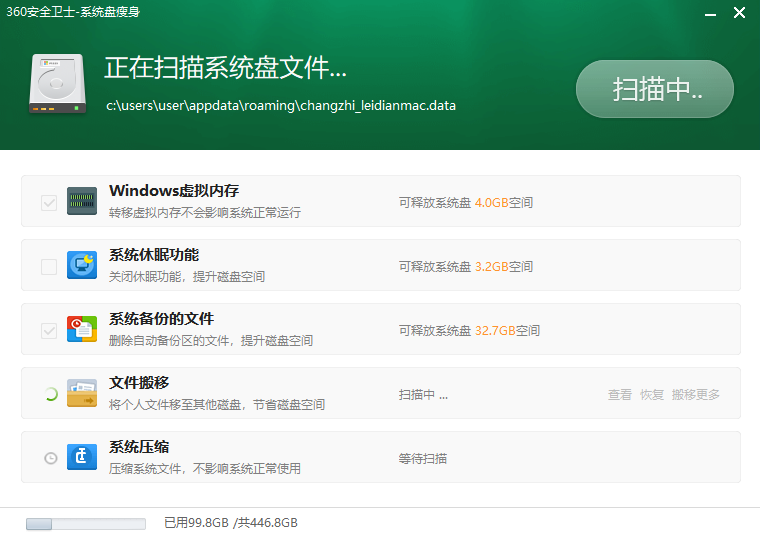 360系统盘瘦身是一款非常好用的系统盘瘦身工具,360系统盘瘦身电脑版可以在软件之中进行硬盘扫描,扫描整个硬盘提取出其中的废弃数据文件,然后可以直接进行删除,该软件可以识别出软件的缓存文件,可以找到无用的数据残并且删除非常强大。