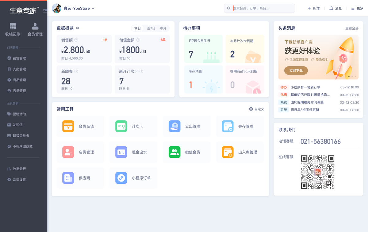 提供优惠券(灵活设面额、条件等)、套餐(组合商品优惠售卖)、买赠(设买送规则)、减免、新会员及转介绍奖励模板,刺激消费、拓展客源 。