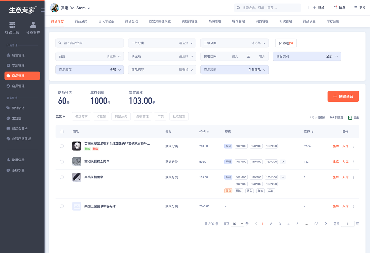 涵盖商品信息录入(含名称、价格、图片等),出入库自动化(扫码识别,实时更新库存),分类管理(按属性等设体系,方便查找),助门店精准掌握库存动态 。
