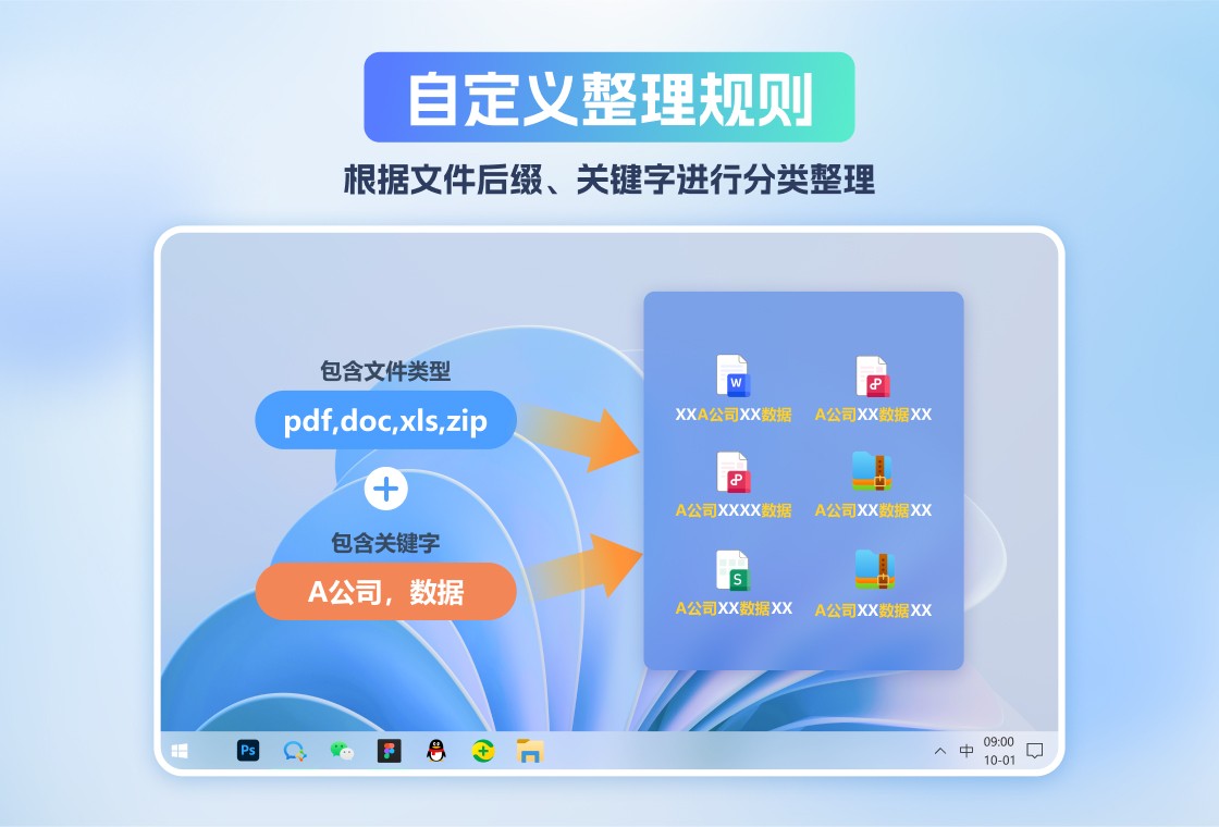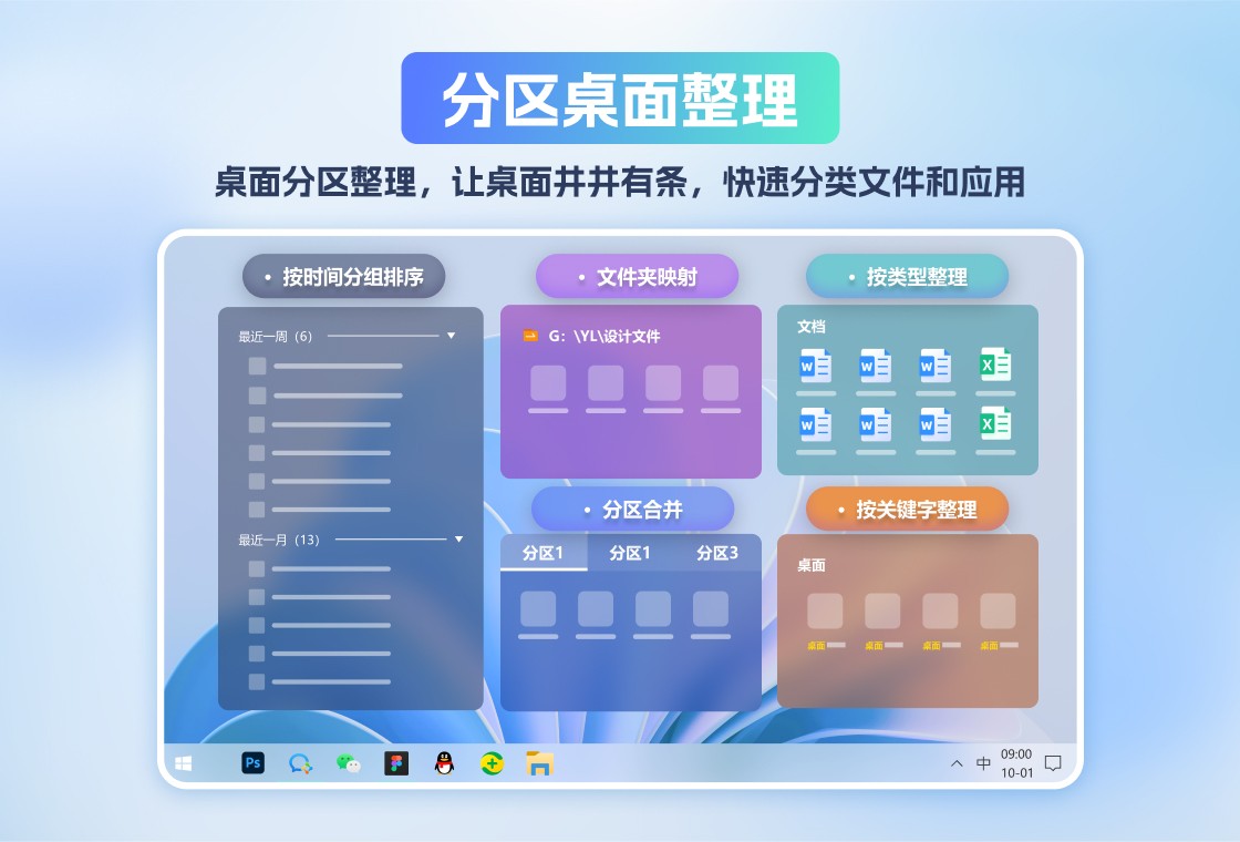 一键将桌面文件按类型、时间等维度自动分类,划分至对应文件夹分区,数秒完成桌面整理。