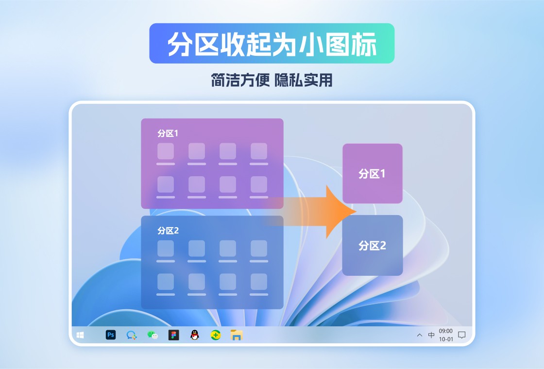 支持自由创建个性化桌面分区,自定义命名、样式;可随时解散分区,灵活调整桌面布局。