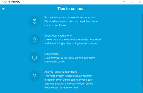 Cisco Proximity电脑版是一款思科推出的一款无线投屏软件,能够让用户通过无线连接的方式简化会议室设备和用户设备之间的互动你,Cisco Proximity最新绿色版中用户可以通过软件轻松的将个人设备的屏幕共享到新的设备上,支持展示演示文稿、文件、视频等。