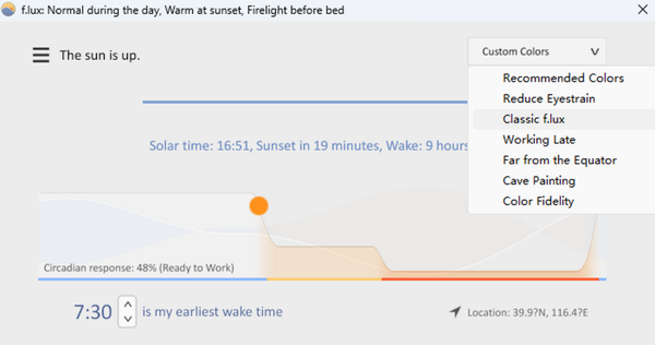 F.lux软件是一款提升电脑设备使用体验的调色软件,F.lux电脑版能够根据设备所处的地理位置和当地的日出日落时间,自动调整屏幕的色温,减少眼睛在长时间使用设备时的疲劳感,并有助于改善睡眠质量,因为蓝光会干扰褪黑激素的分泌。