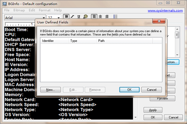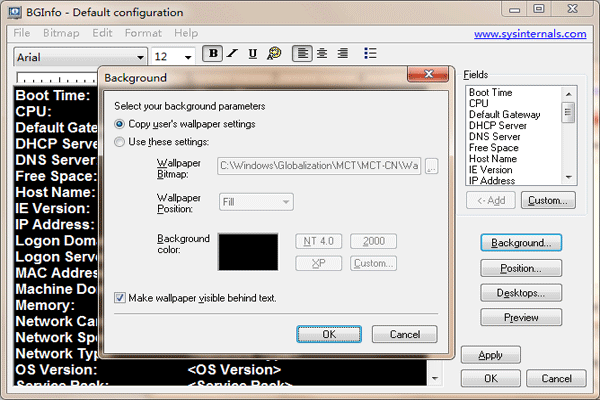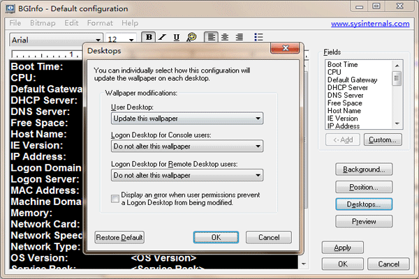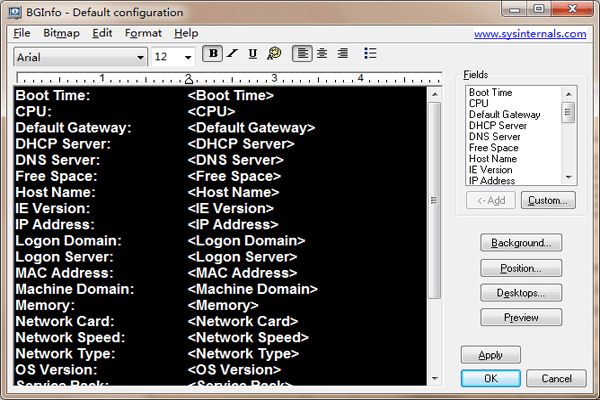 BGInfo中文版是一款功能强大的系统信息显示工具,BGInfo电脑版可以根据需要自定义显示的系统信息类型,方便用户在桌面获取自己所需的信息并对其进行展示,支持用户通过脚本控制字段要显示,还可以添加自己定义的文本和变量。