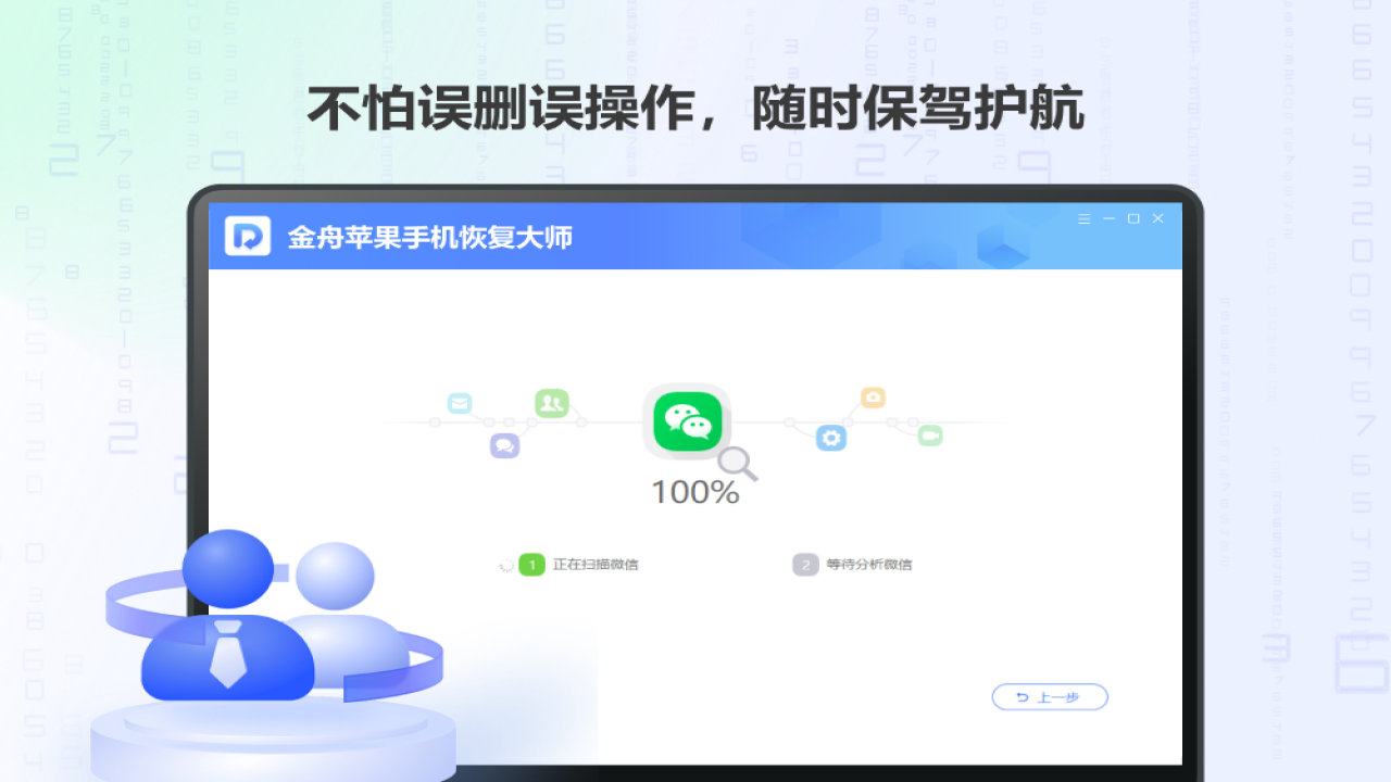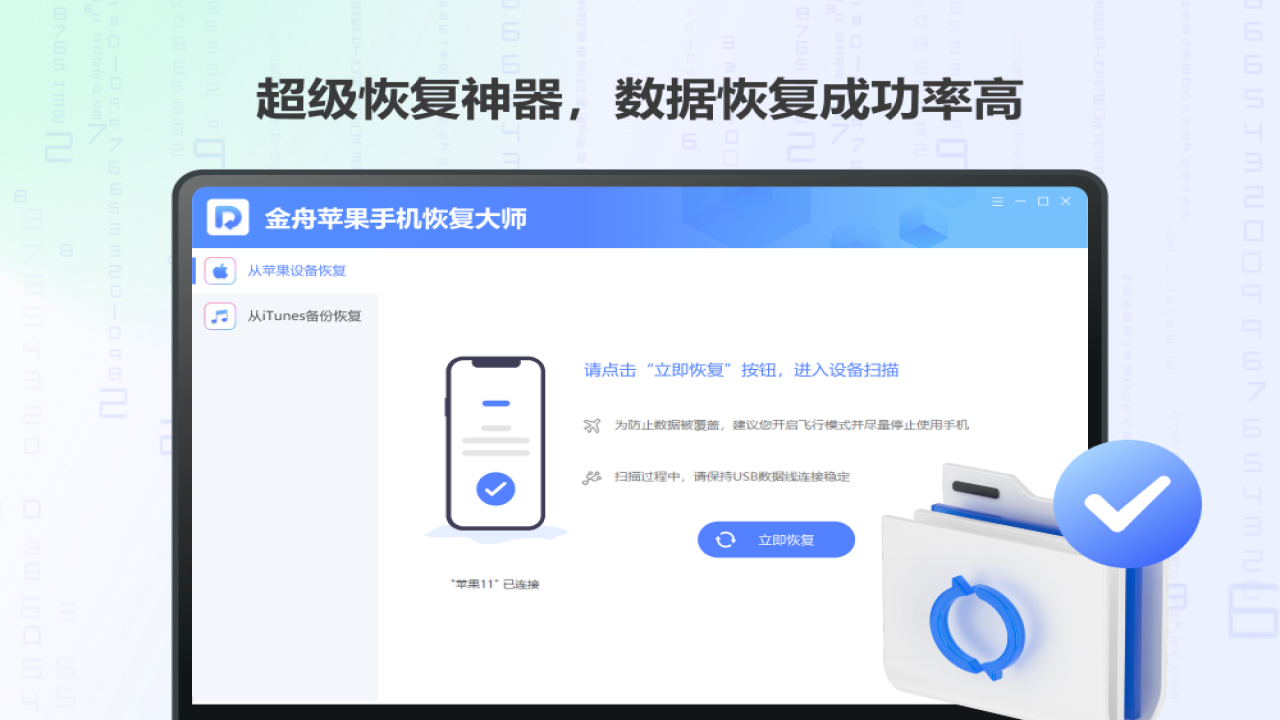 金舟苹果手机恢复大师是一款针对苹果系统的数据恢复软件,金舟苹果手机恢复大师最新版之中用户可以使用该软件快速恢复用户的数据,那些被误删,且没有多久还有数据遗留的文件,可以快速恢复回来,只需要一键就可以恢复文件,非常简单。