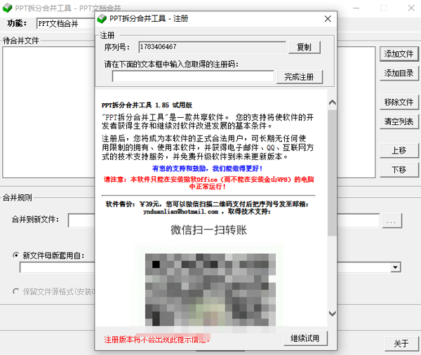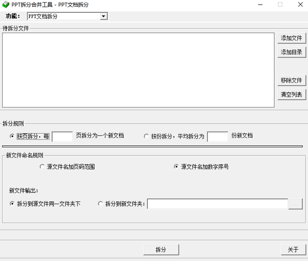 PPT拆分合并工具免费版是一款简单易用的PPT文件拆分合并工具,软件能够将多个PPT文件按用户指定的顺序合并成一个文件,PPT拆分合并工具电脑版可以选择文件的添加的顺序,提供了按页面、文件大小等方式供用户选择,操作简单又方便。