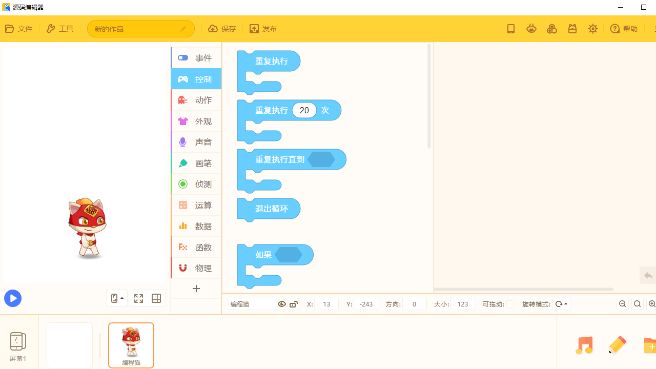 源码编辑器更适合初学者来使用,它有着完整的进阶编程教程,在这里开始先以图形编程代码来吸引青少年,然后还有着多种素材可以进一步引导学习者走向深处,最后有着各种代码内容教学。