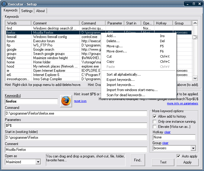 可自定义关键字,关联常用程序、文件等。输入关键字,Executor 依历史记录智能匹配,自动完成输入,通过下拉菜单提供选项,方便精准检索调用。