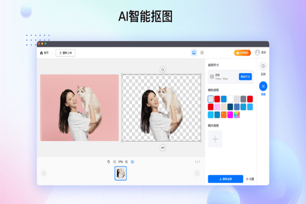 自动抠图:运用智能 AI 技术,能自动识别图片主体,迅速去除多余背景,3 秒即可出图,可得到背景透明的 png 图片。