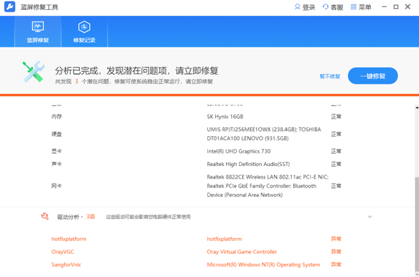 针对系统文件损坏、驱动不兼容、内存故障、病毒感染、硬件冲突等常见蓝屏诱因,内置专属修复模块,覆盖 Windows 各版本主流蓝屏问题。