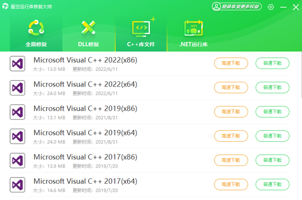 星空运行库修复大师是一款简单好用的运行库修复和优化类软件,能够为用户解决因缺少或损坏运行库而导致的应用程序无法正常启动和运行的问题,星空运行库修复大师软件能够快速扫描系统,检测并列出缺少或损坏的运行库文件,提供修复或安装建议。