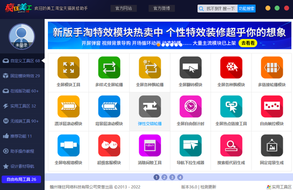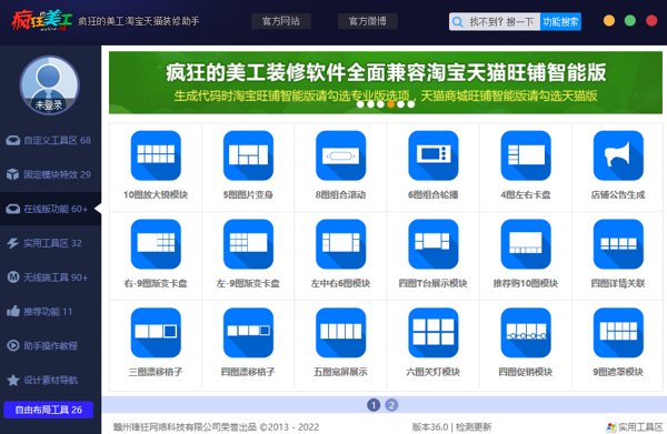 疯狂的美工装修助手电脑版是一款专为淘宝和天猫店铺装修设计的强大软件,疯狂的美工装修助手免费版支持全屏模块的快速生成,商家可以根据需求直接生成适合自己店铺的全屏展示模块,用户可以轻松选择不同的设计风格和布局,无需从零开始制作,让店铺页面更加吸引顾客。