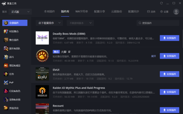 插件资源丰富:收录了正式服、怀旧服的主流整合插件与单体插件,涵盖副本、美化、光环、任务等各种类型,满足玩家多样化的游戏需求。