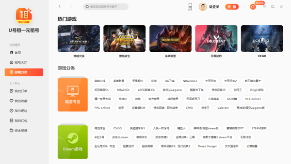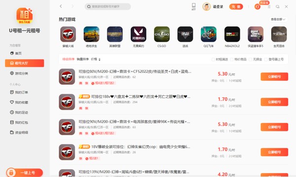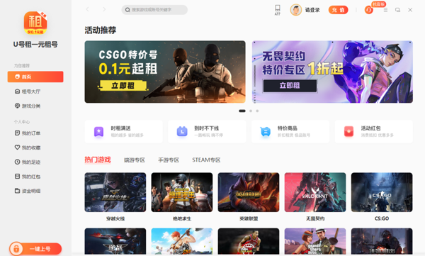U号租2025最新版是一款专业的游戏账号租赁平台,软件涵盖了大量热门的端游和手游账号,不管是想要体验高等、稀有皮肤、强力装备,还是尝试不同的游戏角色,U号租电脑版都能满足大家的需求,不需要用户话费大量的时间和资金提升角色。