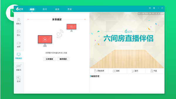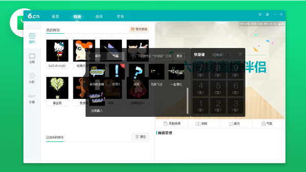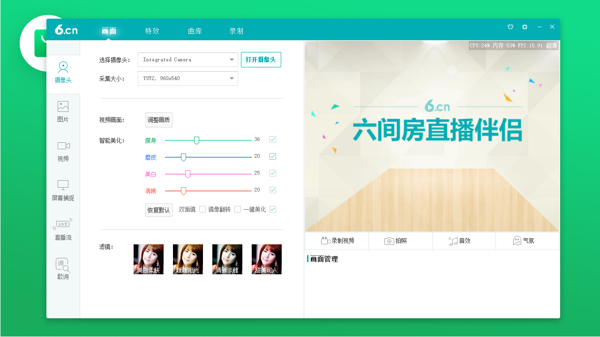 六间房直播伴侣软件提供对直播画面、视频和音频的控制,主播可以轻松调整画面效果和音频设置,还有丰富多样的特效可以调整使用。