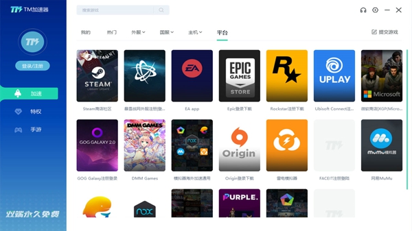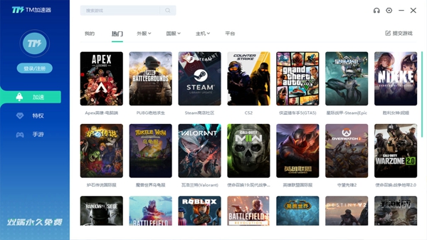 多平台设备支持:支持 Windows、Android、iOS 等多种平台,可覆盖玩家的各种设备,无论使用何种设备玩游戏,都能借助 TM 加速器优化网络,随时随地畅玩游戏。