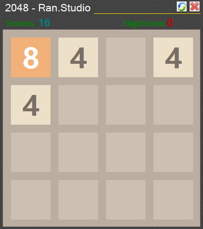 游戏界面为一个 4×4 的网格棋盘。游戏伊始,棋盘上会随机生成两个数字方块,方块上的数字通常是 2 或者 4.它们会分布在棋盘的不同空格处。