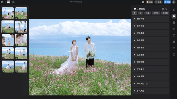 在修图过程中,用户可实时预览修图效果,针对脸部、五官、皮肤、液化和 AI 智能调色等方面进行实时调整。