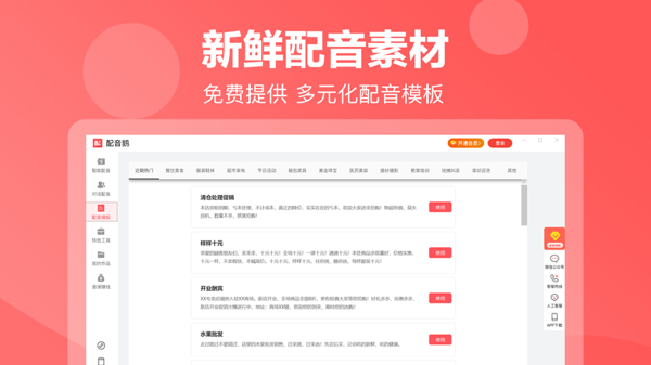 针对不同行业和应用场景,配音鹅提供了海量广告模板。无论是广告促销、产品宣传,还是美食餐厅推广、地摊叫卖,用户都能从中找到合适的模板,快速制作出专业水准的广告配音。
