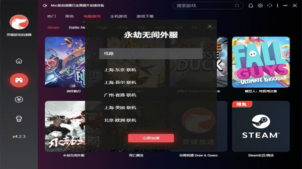 灵缇游戏加速器电脑版是一款专为解决游戏网络延迟问题的软件,灵缇游戏加速器2025最新版能够优化网络速度,提升的网络传输的速度等,帮助玩家提高游戏连接的稳定性,减少延迟和卡顿的问题,为用户提供多种加速线路,帮助玩家快速连接到离游戏服务器最近的节点。