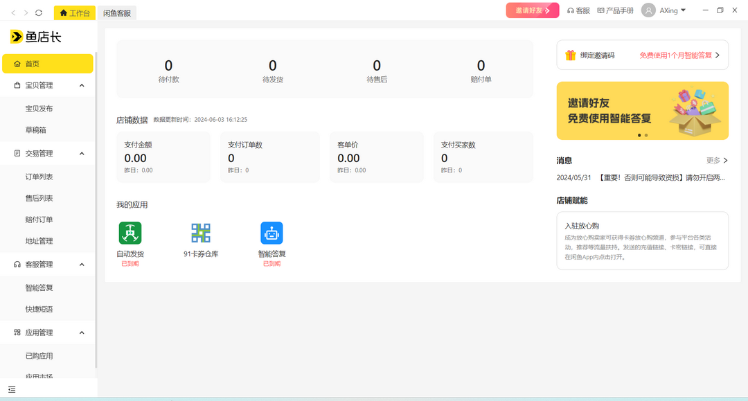 鱼店长之中用户可以使用该软件来回答客户的咨询以及订单追踪情况,该软件有着非常不错的智能答复、自动擦亮、售罄自动上架等等功能,帮助用户轻松玩转闲鱼平台。