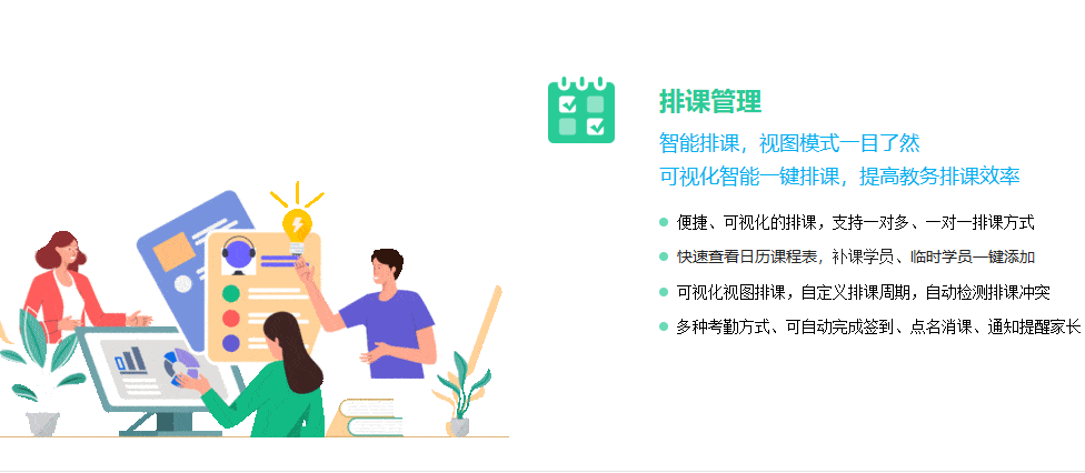 实现学员全周期管理,智能排课消课,搭建家校高效沟通桥梁,提供续费预警。